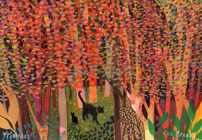 *Max Bygraves voice* "I wanna tell you a story..We're in the process of selling our house in Rochester (now sold it seems) and relocating back to our spiritual home of Sandwich/Deal in Kent. To this end our son Felix has moved in with my sainted mother and started school in Sandwich. So I spent some time down there while he had his first few days at his new school. One evening we cleared off to Deal so he and his cousin PJ could have a swim in the sea and the next night Felix and I went for a walk around the village where mum lives. We walked for nearly two hours (more a reflection of our gait rather than the size of the village) we visited my dads grave in the churchyard (not as maudlin an activity as it sounds) and then, spurred on by this, we carried on to trek to a secret wood that my dad used to take us to when we (my brother, sister and I) were nippers. The woods are called The Brooks and seemed entirely magical when we were small. There were deep holes in the beds of the brooks which bubbled continuously (these, we named inky-pinks) and glorious trees that created a splendid church-like canopy. Thankfully they remain untouched and it was really lovely to take my son on the same journey that my dad took us nearly 40 years ago (even though I wasn't able to cut horseradish roots out of the path like he could) This painting of Oscar and kitten exploring the woods is a celebration of a particularly lovely evening spent with my own kitten. I hope that you like it rxx Rochester September 2013