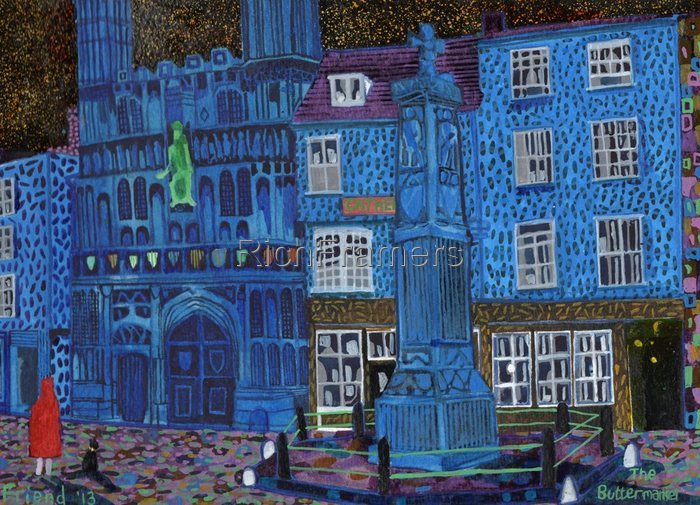 This is a painting made in 2013. The original has been sold but a limited number of signed prints are still available.This is a painting of a favourite are of Canterbury. The Buttermarket is just outside athe Cathedral gates and was a lovely place to hang out when we were slack-jawed yoofs! (probably still is)
